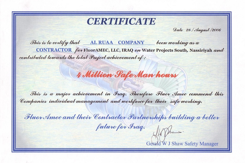 received by Fluor® amec acknowledging that REGCC contributed towards “4 million safe man hours” – a major achievement in Iraq​